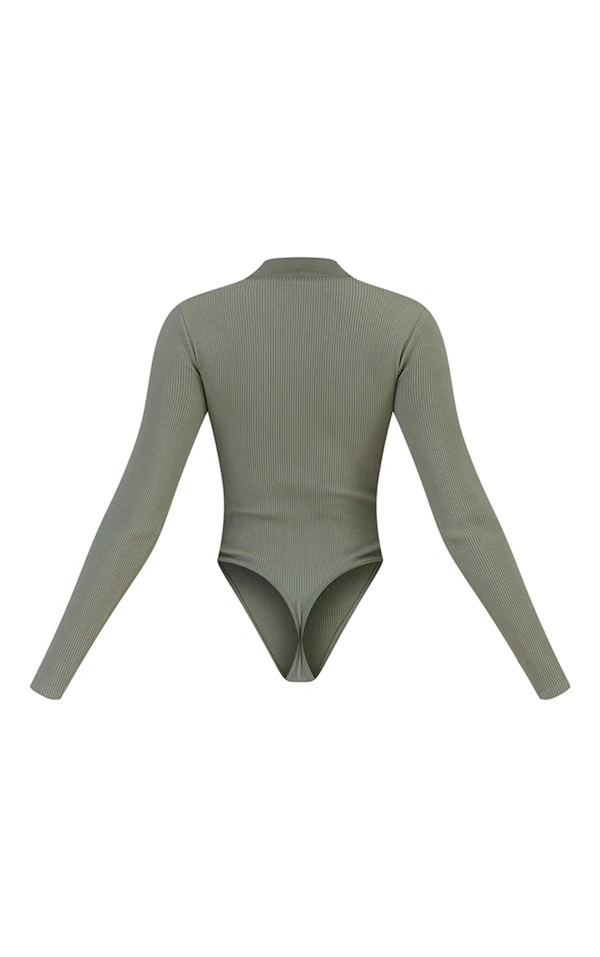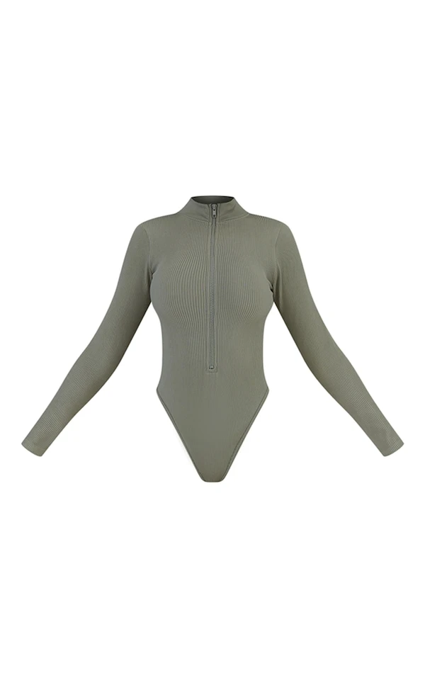 Body zippé gris clair côtelé détail contours à manches longues