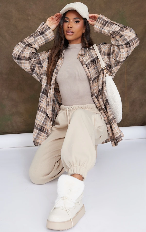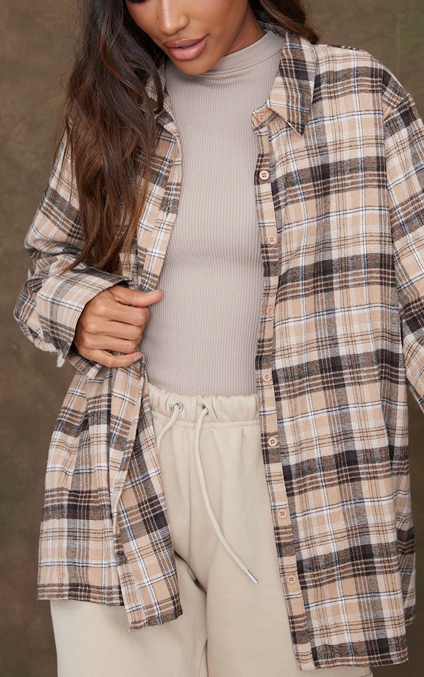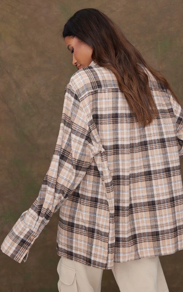 Chemise oversize beige à carreaux en flanelle