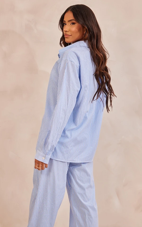 Chemise oversize boutonnée en maille tissée bleue à fines rayures