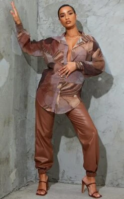 Chemise oversize en maille beige imprimé abstrait