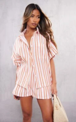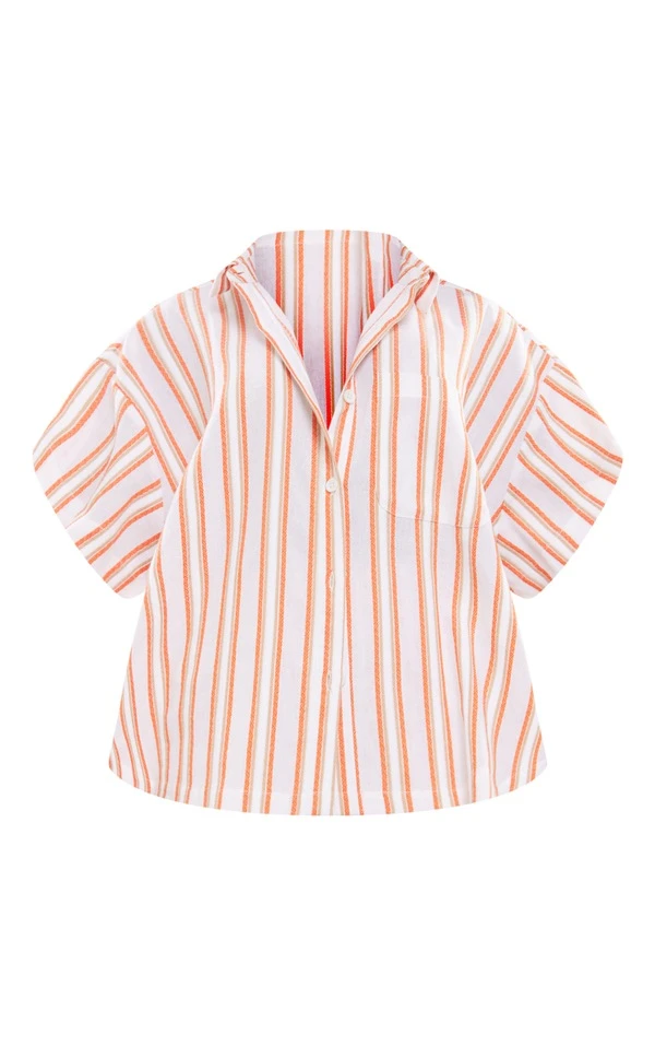 Chemise oversize orange en effet lin texturé à rayures et épaules carrées