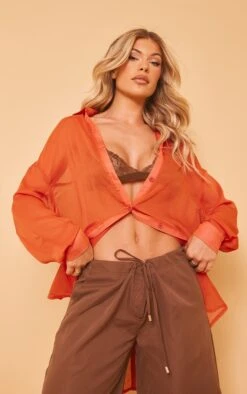 Tout le monde est d’accord pour dire que cette chemise est un crush absolu ! Avec sa maille texturée de couleur rouille, son design à boutons dans le dos et sa matière légère, elle est si belle. On la porte avec un pantalon effet lin et des sandales. Trop jolie !