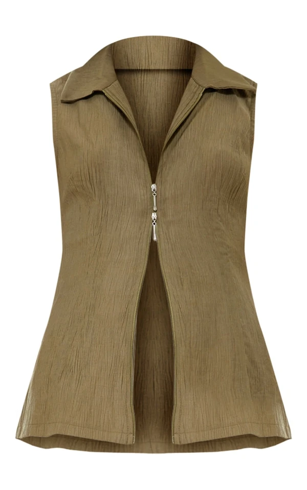 Chemise zippée sans manches kaki en maille tissée texturée et transparente