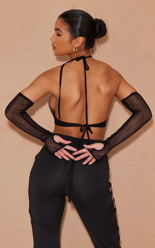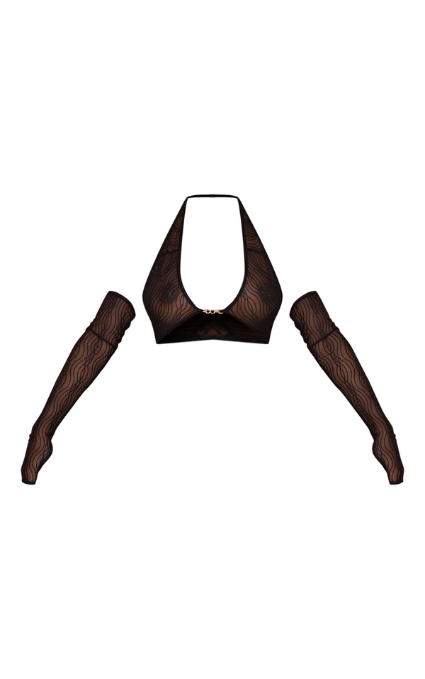 Crop top en mesh noir texturé à épaules dénudées et détail chaîne