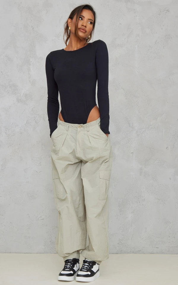 Crop Top Manches Longues Structuré Côtelé Gris Clair Détail Contours