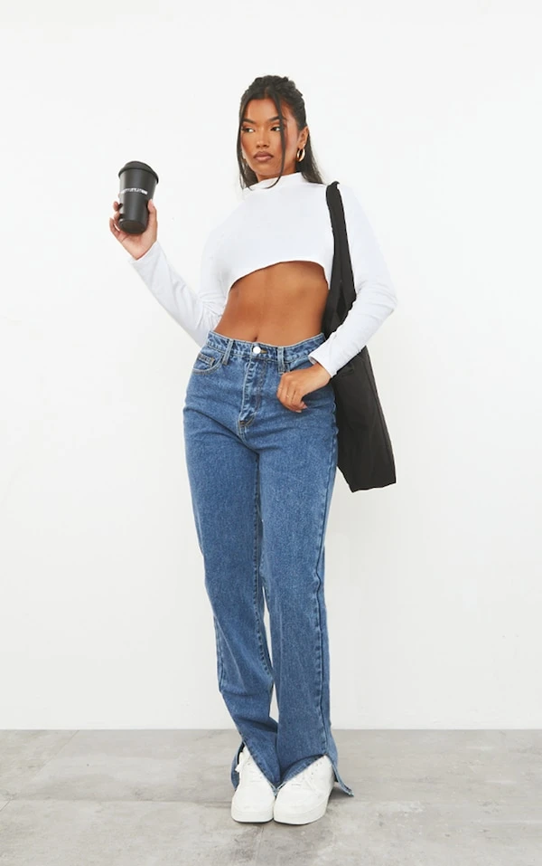 Love sur ce jean bleu ! On adore la matière effet vintage, l’ourlet fendu et la coupe droite. Il ne manque plus qu’un body blanc et des talons pour finaliser cette tenue classique.