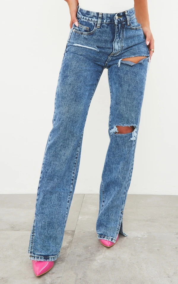 Stylé le jean! Avec sa coupe déchirée, son bleu mpyennement délavé et son ourlet fendu, il nous a fait craquer. Il ne manque qu’un body et une paire de talons!