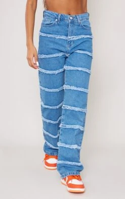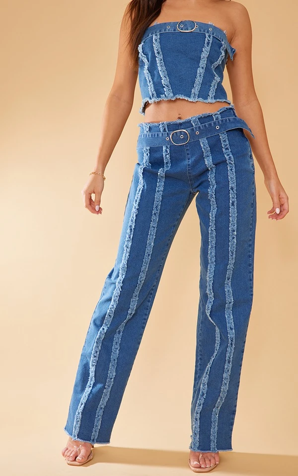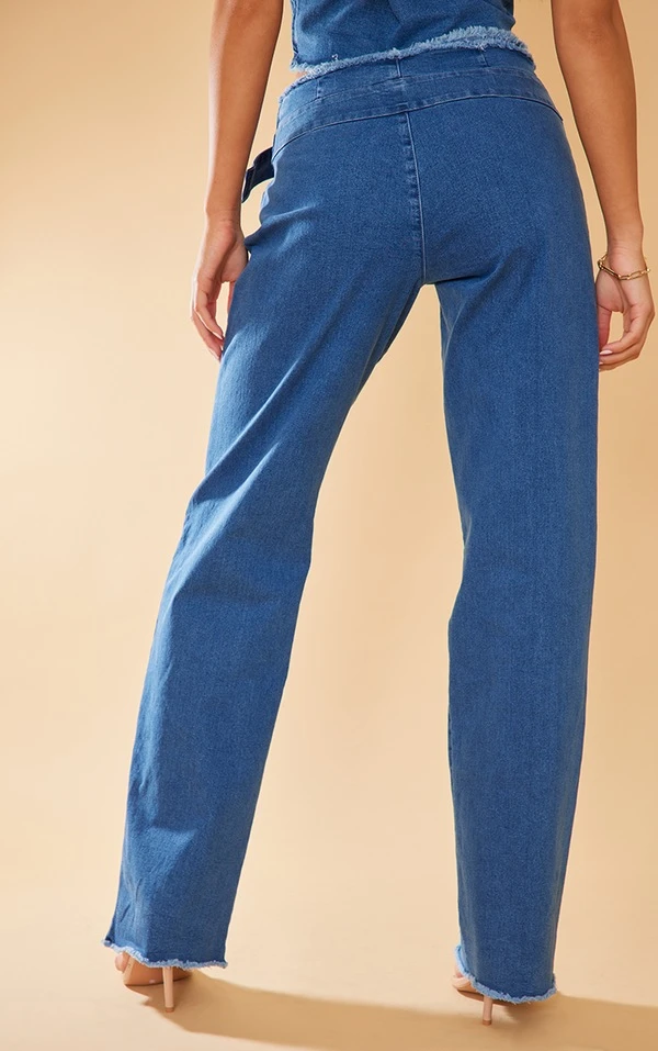 Jean droit bleu moyen délavé à ourlet déchiré et détail ceinture