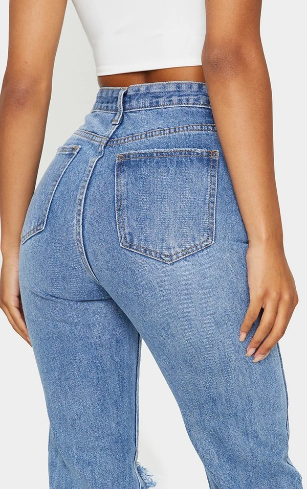 Jean droit bleu moyennement délavé ouvert sur le genou