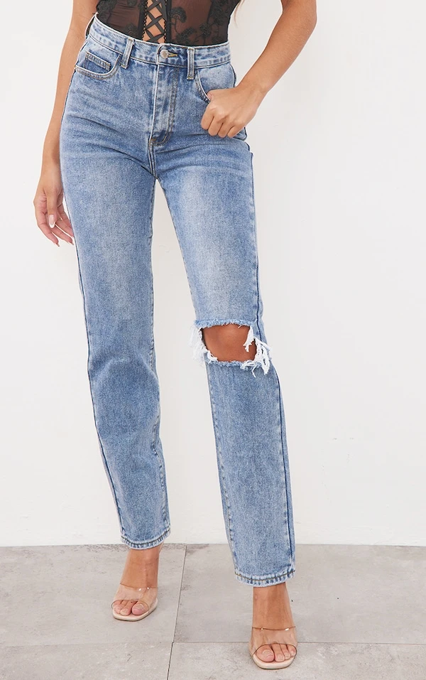 C’est le jean qui vient se shopper immédiatement les filles. Il possède une coupe droite, un délavage bleu clair et une ouverture sur le genou plutôt cool. Plus qu’à enfiler un jean et des mules à talons.