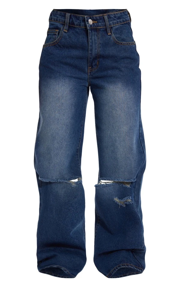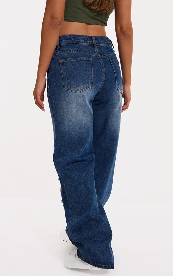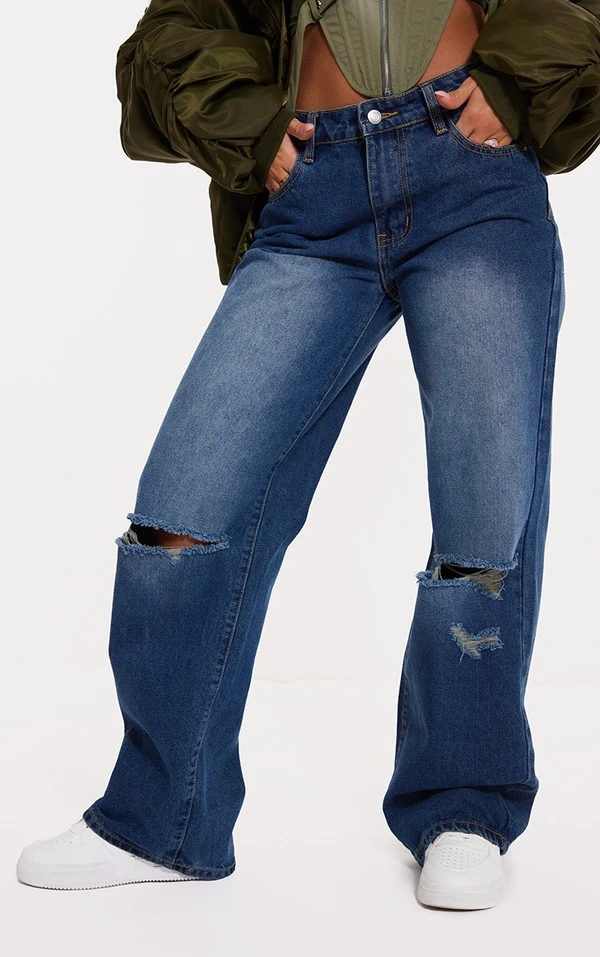 Jean droit délavé vintage à taille basse et genoux déchirés