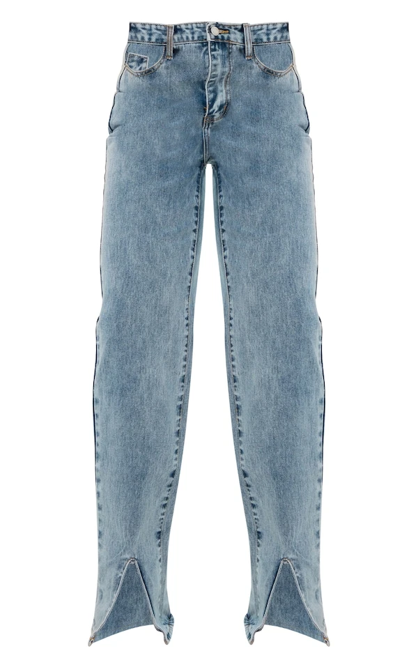 Jean droit long bleu clair délavé à ourlet fendu devant
