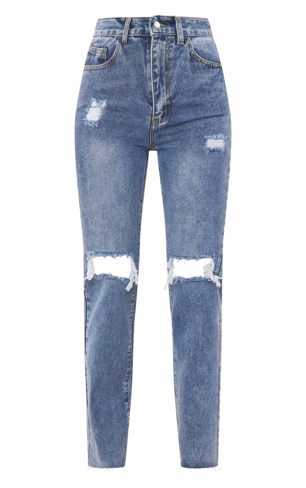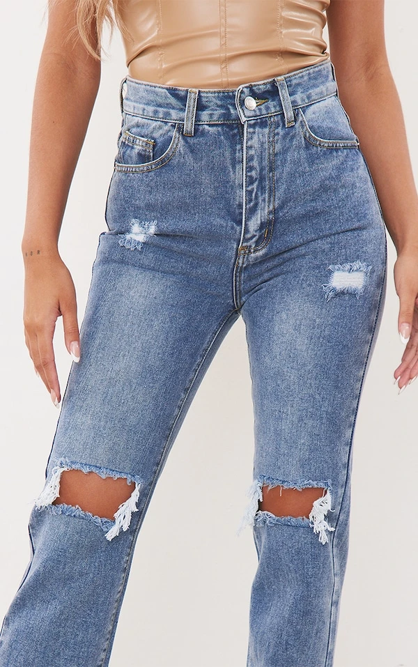 Jean droit taille haute bleu moyennement délavé à genoux déchirés