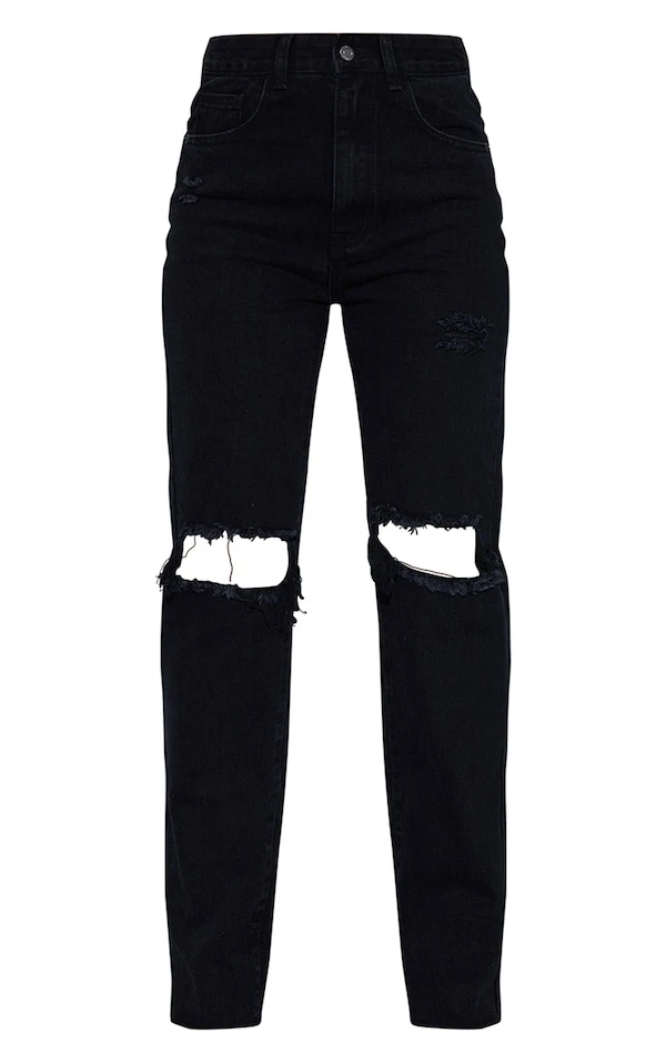 Jean droit taille haute noir délavé à genoux déchirés