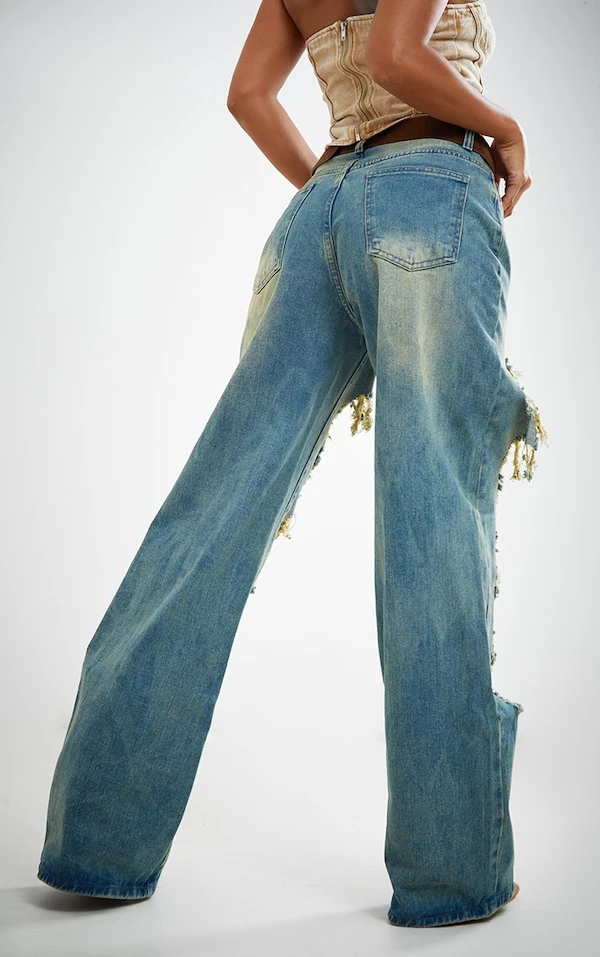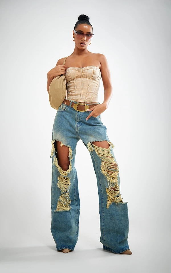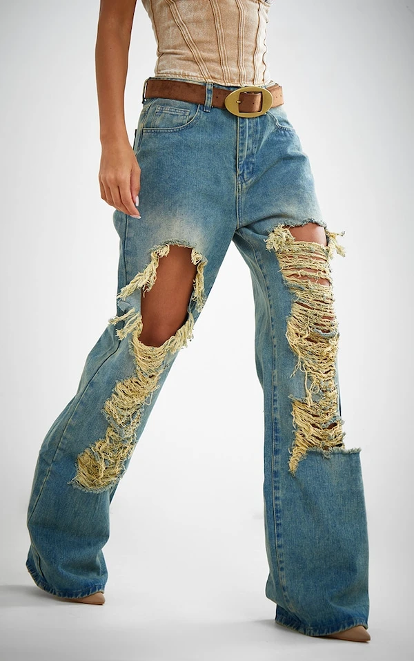 Jean droit très déchiré sur l’avant délavage indigo vintage