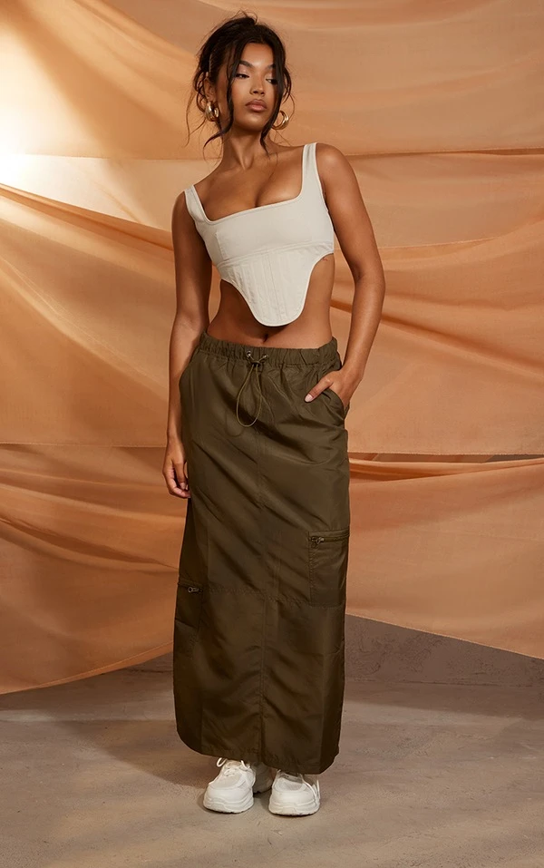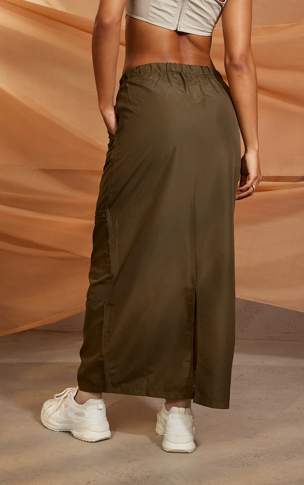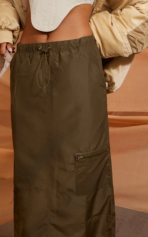 Jupe cargo longue kaki à zip et cordons ajustables