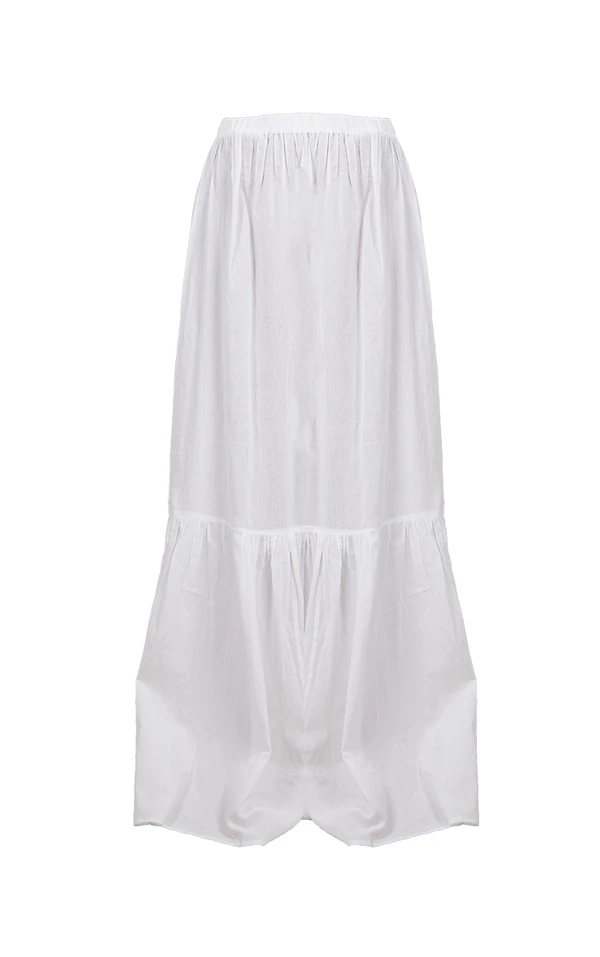 Une vraie vision bohème, la jupe longue! Avec son effet lin et sa couleur blanche, c’est un classique de l’été!. Il ne manque que le top assorti et des accessoires pour compléter le tout!