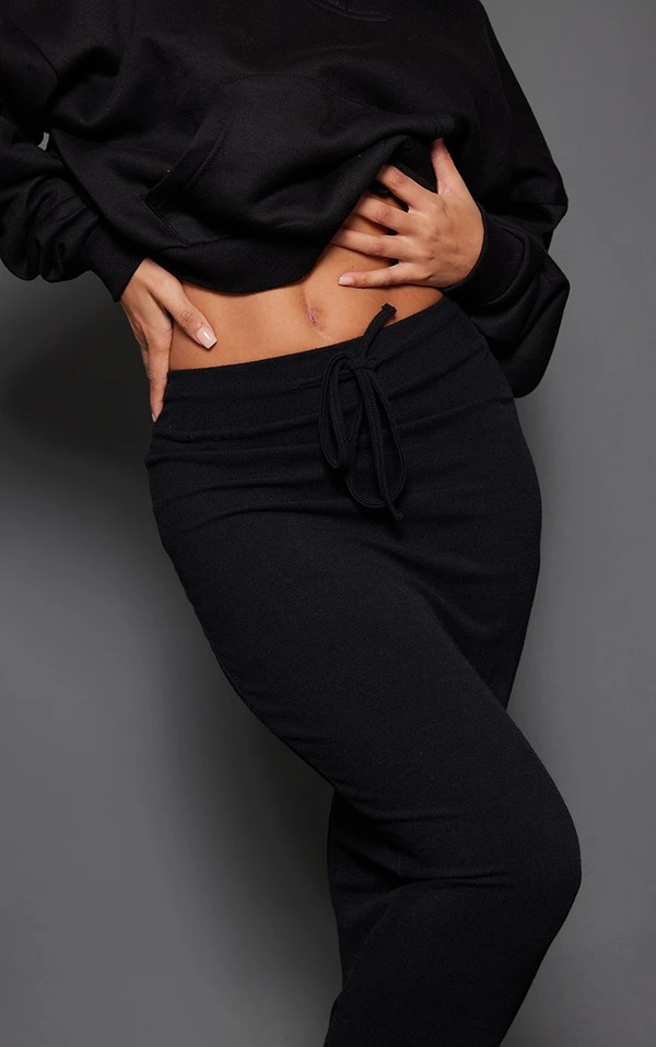 Jupe longue côtelée noire à cordons ajustables sur la taille