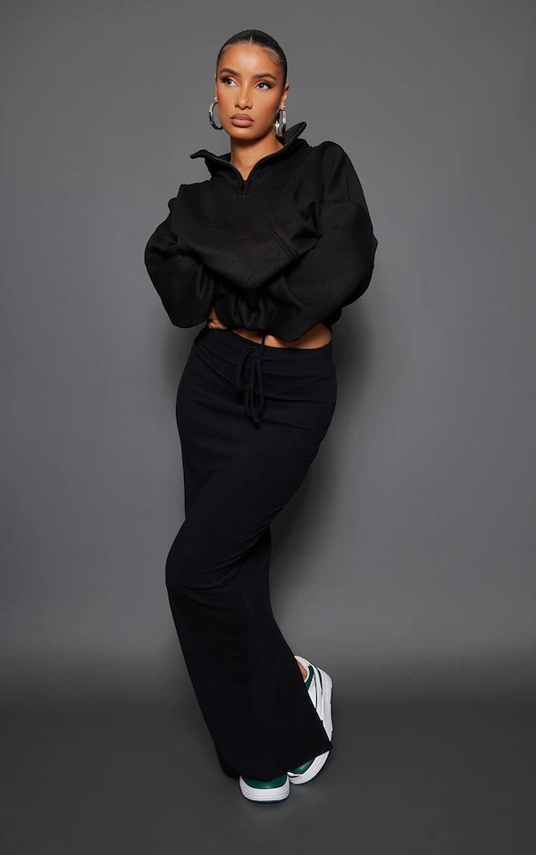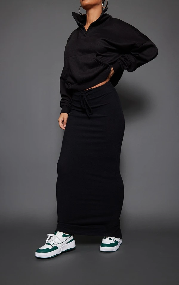 Trop canon dans cette jupe à la coupe très longue ! On adore sa matière côtelée stylée, son coloris noir qui va avec tout et son design à cordons ajustables sur la taille hyper pratiques. Plus qu’à enfiler un sweat et quelques bijoux. On adore !