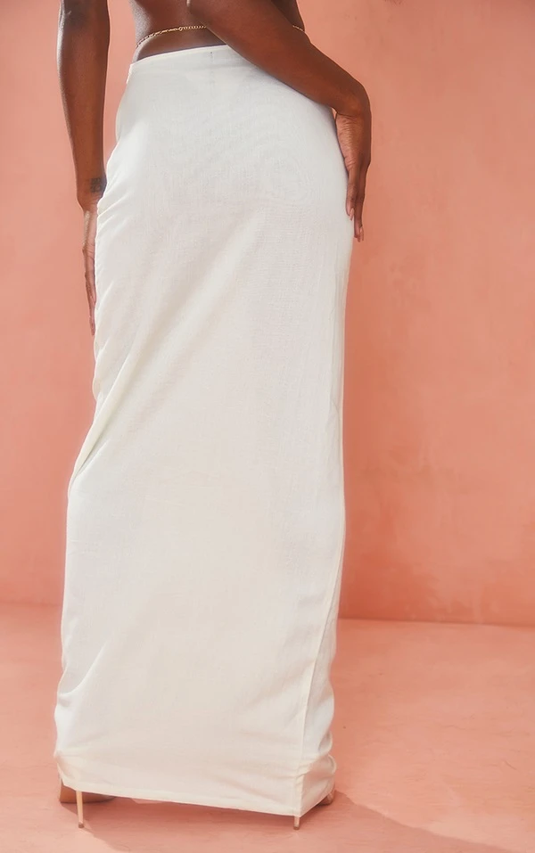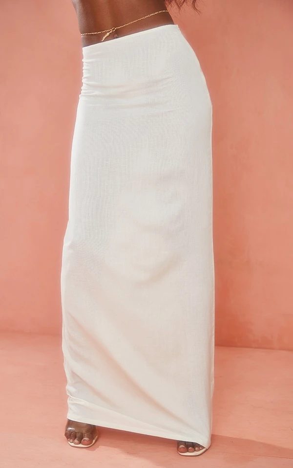 Chic & confident avec cette jupe longue ! Avec sa couleur crème, sa matière tissée, sa taille en V et ses fronces, c’est un crush. On enfile le crop top assorti et on se la joue queen du style au prochain brunch.