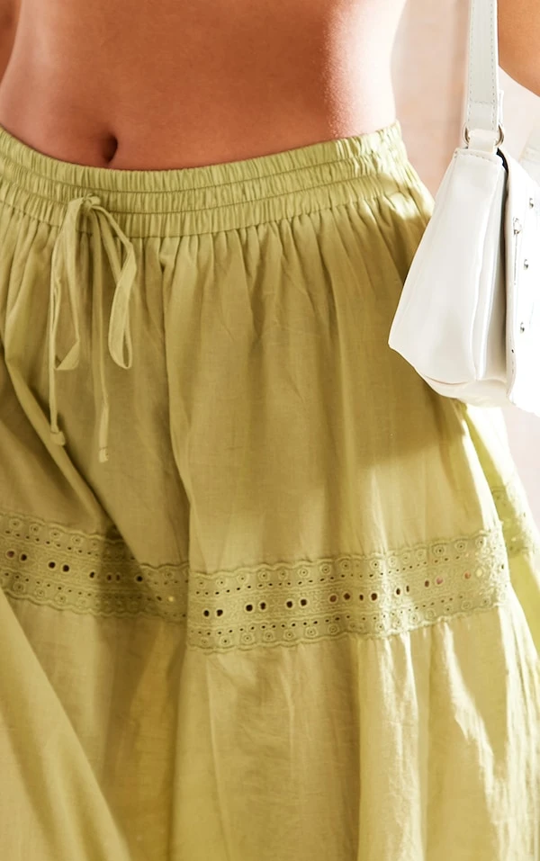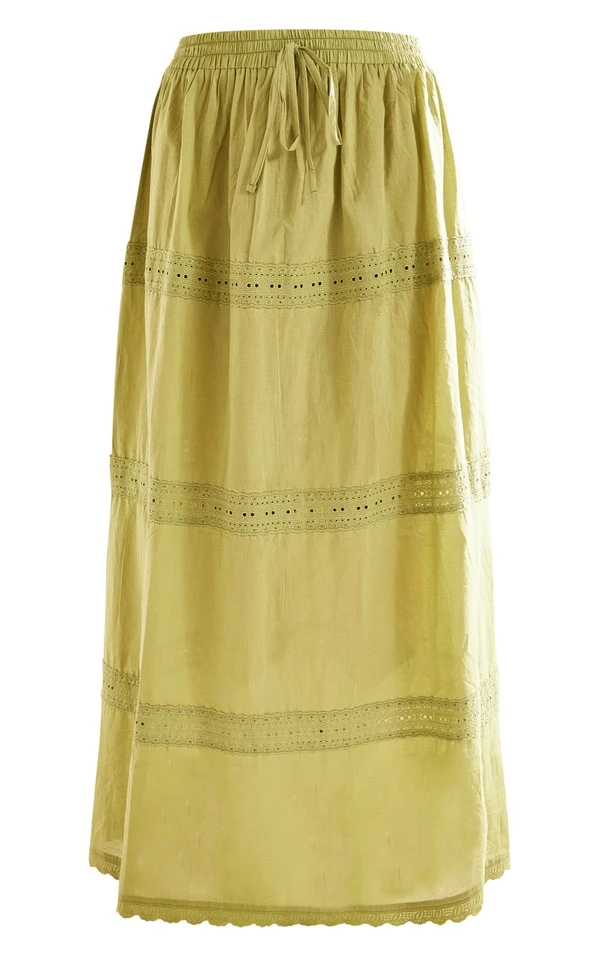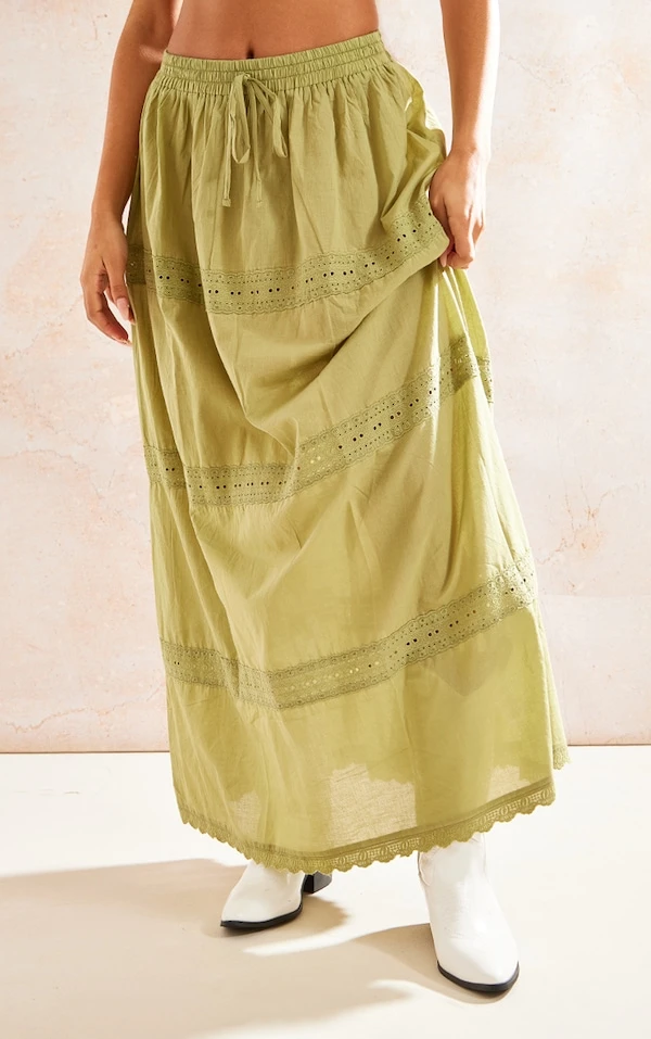 On shoppe illico cette jupe longue ! Avec sa couleur kaki tendance, sa matière en coton et le détail de sa dentelle, on ne peut pas résister. Elle se porte avec un crop top et une paire de bottines pour un look style bohème ultra canon. Encore un look sensationnel !