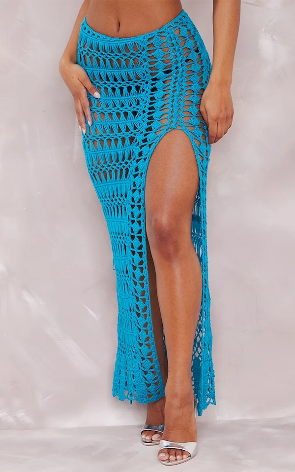 Jupe longue en maille crochetée turquoise à fente latérale