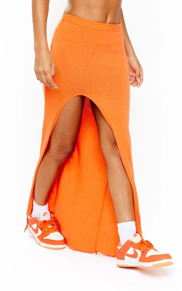 Jupe longue en maille tricot orange très fendue