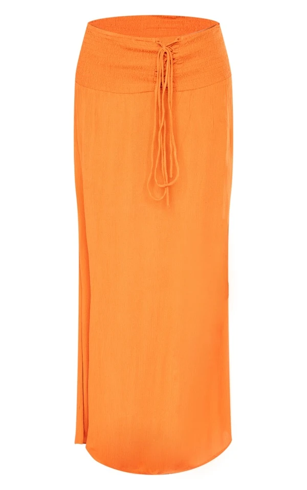 Jupe longue fluide en étamine rouille à taille nouée et froncée