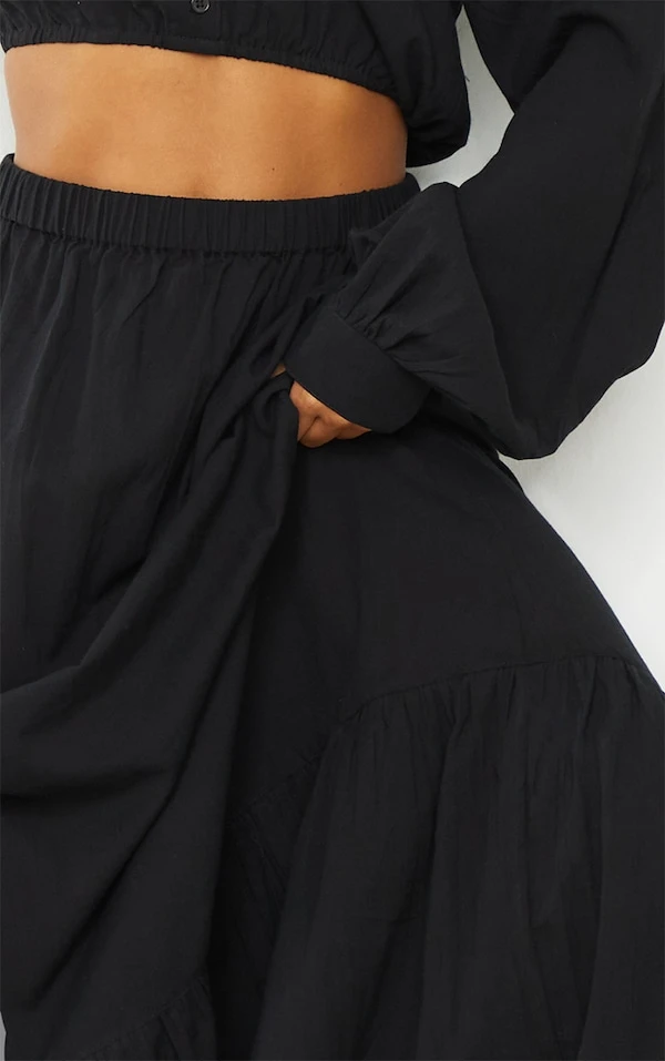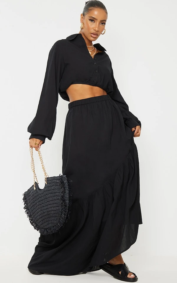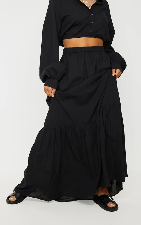 Totalement fans de cette jupe à la coupe longue canon dans son coloris noir qui se porte avec tout. On aime sa matière effet lin que l’on porte avec un haut de la même couleur et une paire de sandales. Love it!
