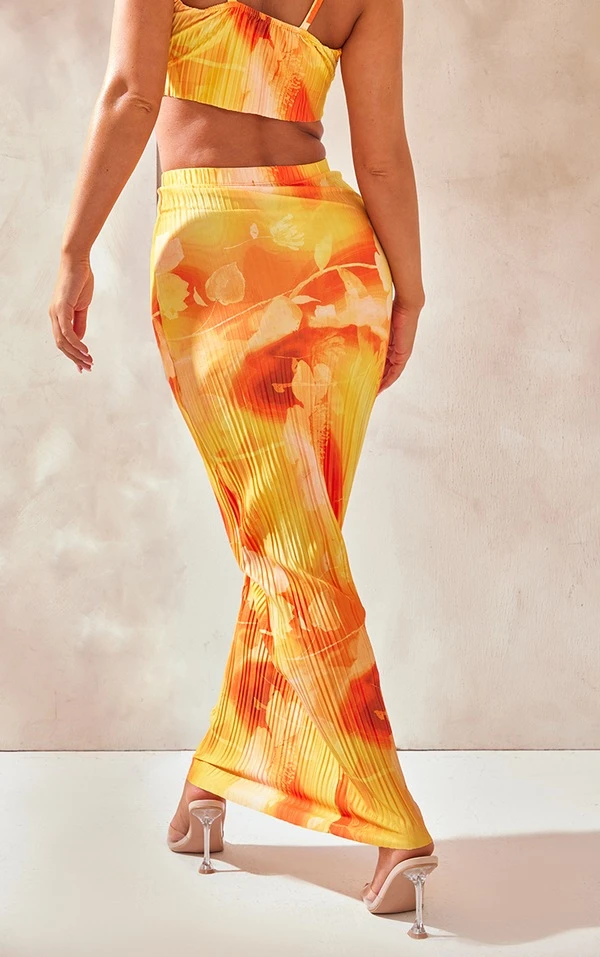 Jupe longue plissée orange imprimé abstrait