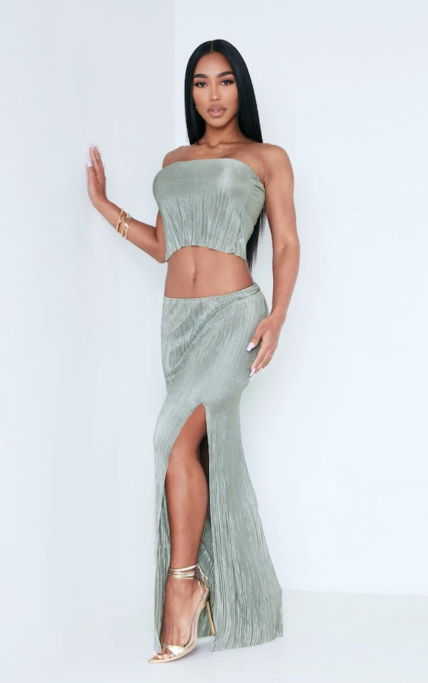 Jupe longue plissée vert saige kaki à taille basse et ourlet fendu
