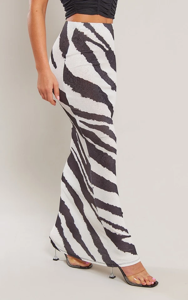 Jupe longue taille basse en mesh dévoré imprimé zébré noir