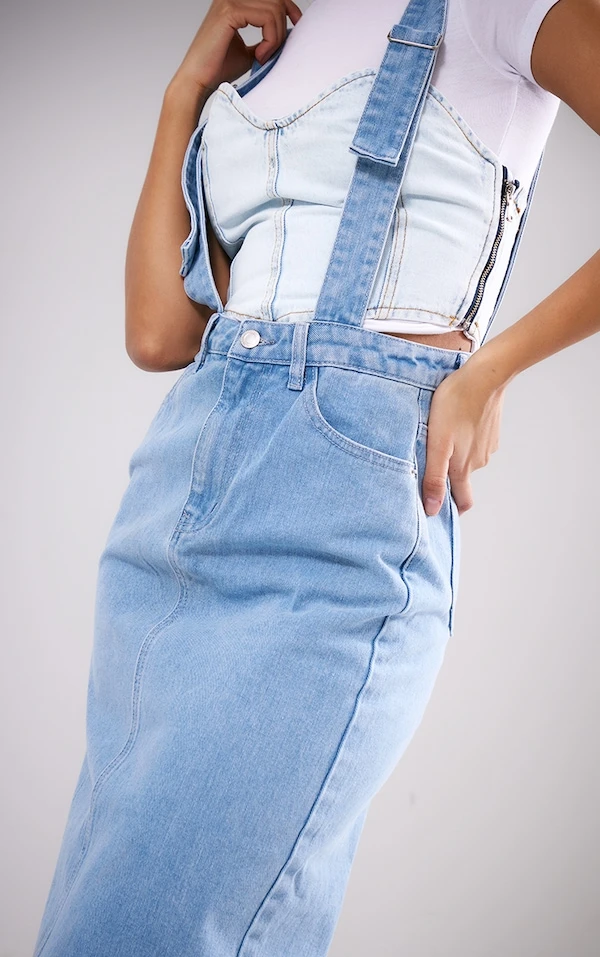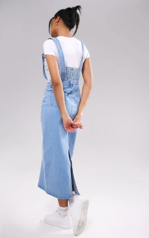 Jupe mi-longue en jean bleu clair délavé à bretelles