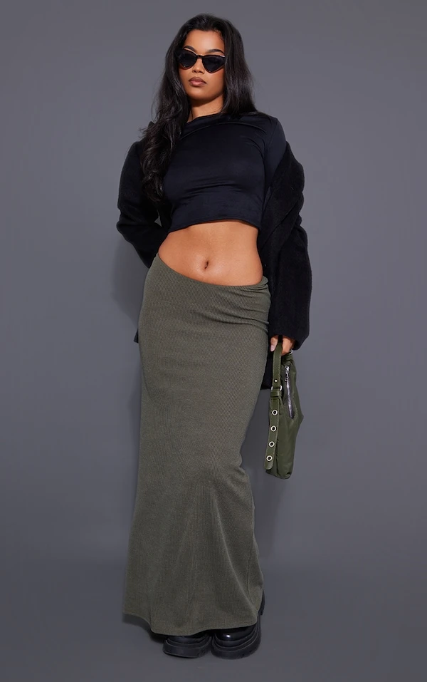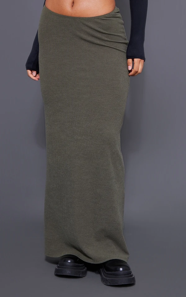 Jupe longue côtelée crêpée kaki à taille incurvée
