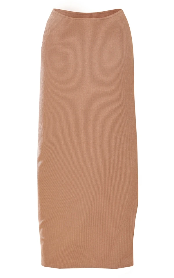 Jupe longue côtelée crêpée taupe à taille incurvée