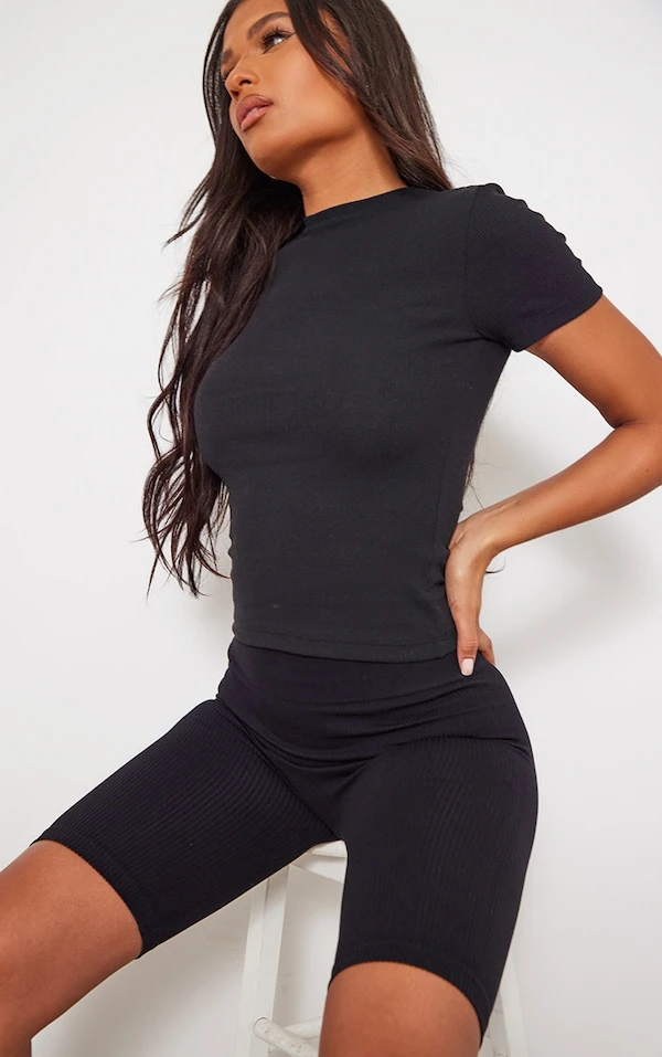 In love du coloris noir indémodable de ce t-shirt. Avec sa matière côtelée et sa coupe à manches courtes, on le porte avec un short cycliste de la même couleur, une paire de baskets et un sac en nylon de couleur flashy. Et vous, vous le portez comment ?
