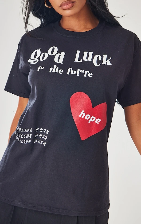 Tee-shirt noir délavé imprimé Good Luck et coeur