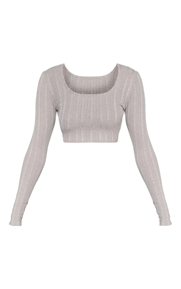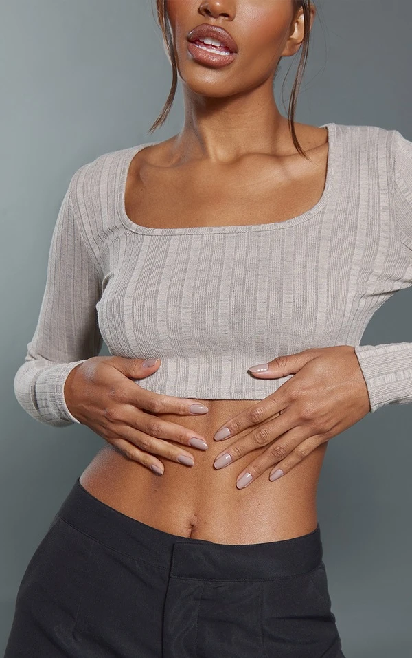 Top côtelée taupe chiné à manches longues