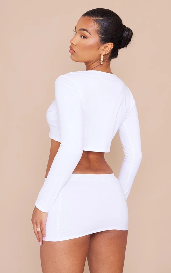 Le crush est infini pour ce top basique ! Avec son coton tout doux, sa couleur blanche et sa coupe courte à manches longues, c’est impossible de résister. Il se porte en total look blanc avec la jupe assortie et des talons de la même couleur !